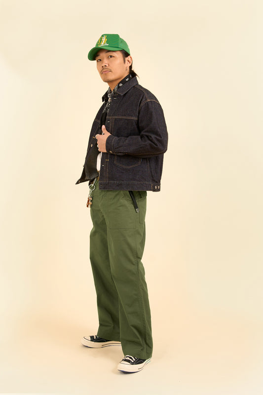 13.5oz selvedge denim, woven on shuttle looms from Zimbabwe cotton, gives it that dry, rope-dyed texture that fades beautifully over time. Copper rivets, iron donut buttons and a proper cinch-back round things out with solid, workwear credibility.