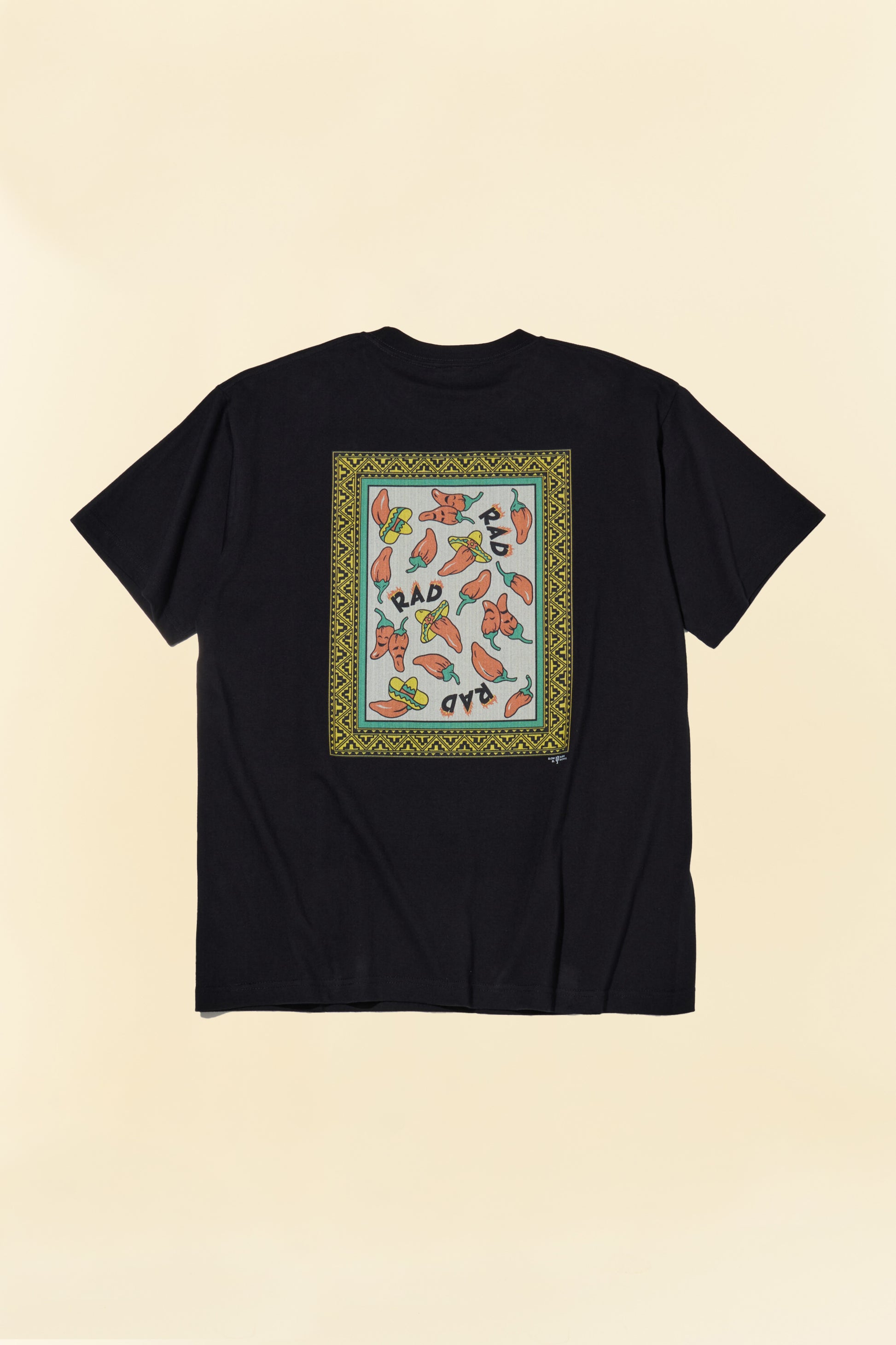 This crew neck T-shirt with a chest pocket offers a soft, comfortable feel and features graphics on the front and back inspired by vintage Mexican bandanas, blending casual wear with a touch of heritage design.