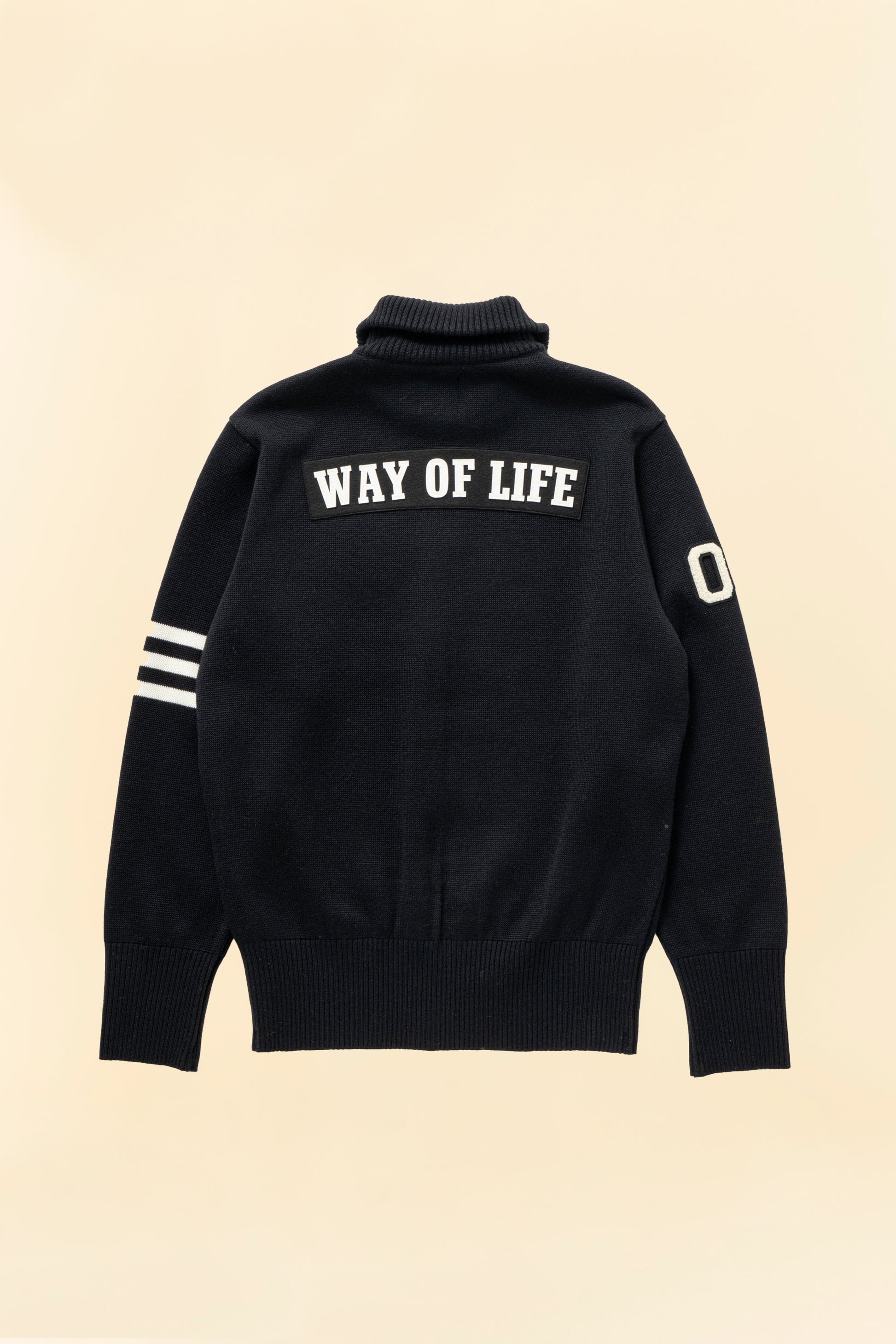 Made from a soft acrylic and wool blend, it delivers warmth, flexibility, and a comfortable fitted shape. Signature details include the RATS felt patch on the chest, the “WAY OF LIFE” motif on the back yoke, and the “03” sagara patch with jacquard stripes on the sleeve.